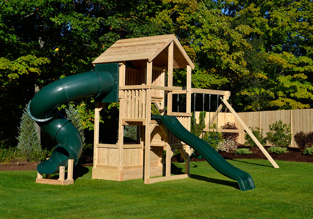 Put a smile on their faces all year long! The Quad Deluxe features our super duper fast tube slide, wave slide, four different climbing levels, and a wood roof. Add a tall rock wall or monkey bars for the older kids.